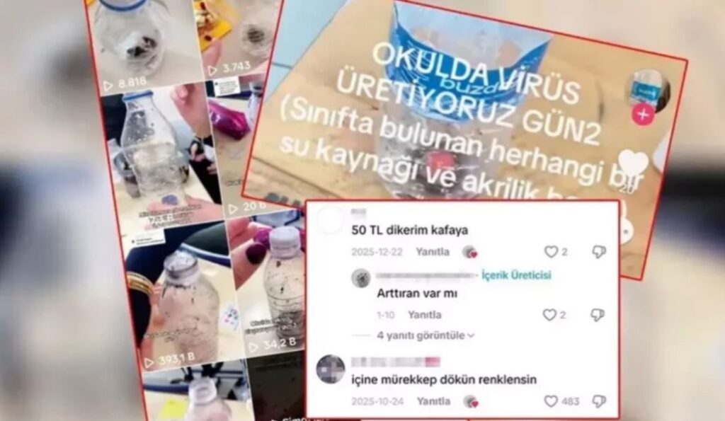 TikTok ve Instagram gibi platformlarda “virüs üretiyoruz” temalı hesaplar açan öğrenciler, şişelere çeşitli maddeler ekleyerek tehlikeli karışımlar hazırlıyor. Süt, yağ, çürümüş yemek artıkları, boya, sigara izmariti, balgam, örümcek ağı, hayvan dışkısı ve hatta idrar gibi maddelerin kullanıldığı bu “deneyler”, öğrencilerin gülerek ve eğlenerek yaptığı görüntülerle sosyal medyada paylaşılıyor.