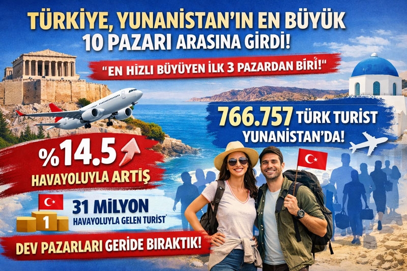 Turizm Databank’ın 2025 yılı verilerine göre, Türkiye, Yunanistan’ın en büyük 10 turizm kaynağı arasına girerek dikkat çekici bir başarıya imza attı. Özellikle havayolu ile yapılan seyahatlerde yakalanan %14,5’lik artış, Türkiye’yi en hızlı büyüyen ilk üç pazar arasına taşıdı.