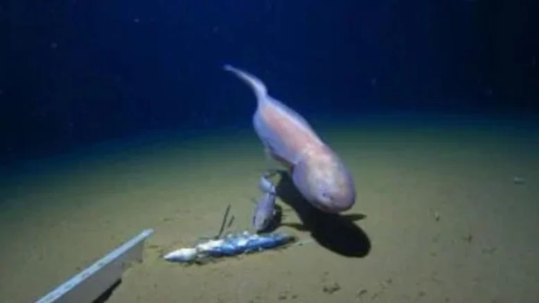 Yaklaşık 9 bin metre derinlikte tespit edilen bu canlı, araştırma ekibi tarafından iki kez görüntülendi: