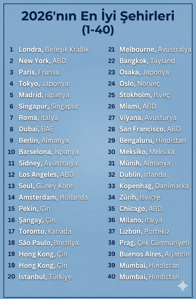 Türkiye’den listeye giren tek şehir olan İstanbul, 20’nci sırada yer aldı. Şehir özellikle alışveriş, turizm ve sosyal yaşam alanlarında öne çıkarken, küresel ziyaretçi ilgisi ve dijital görünürlüğüyle üst sıralarda kendine yer buldu. Avrupa ile Asya’yı birleştiren stratejik konumu ve zengin tarihi mirası, İstanbul’un sıralamadaki yerini güçlendiren başlıca faktörler arasında gösteriliyor.